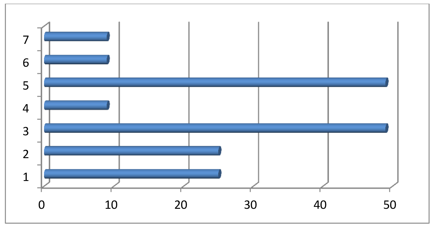 Рис. 1. Структура публикаций по запросу «реабилитация комбатантов» на платформе Киберленинка 2019–2023 г. По оси абсцисс – число публикаций, по оси ординат – область научного знания: 1 – клиническая медицина; 2 – науки о здоровье; 3 – психологические науки; 4 – социологические науки; 5 – политологические науки; 6 – право, политика, философия; 7 – философия, этика, религиоведение