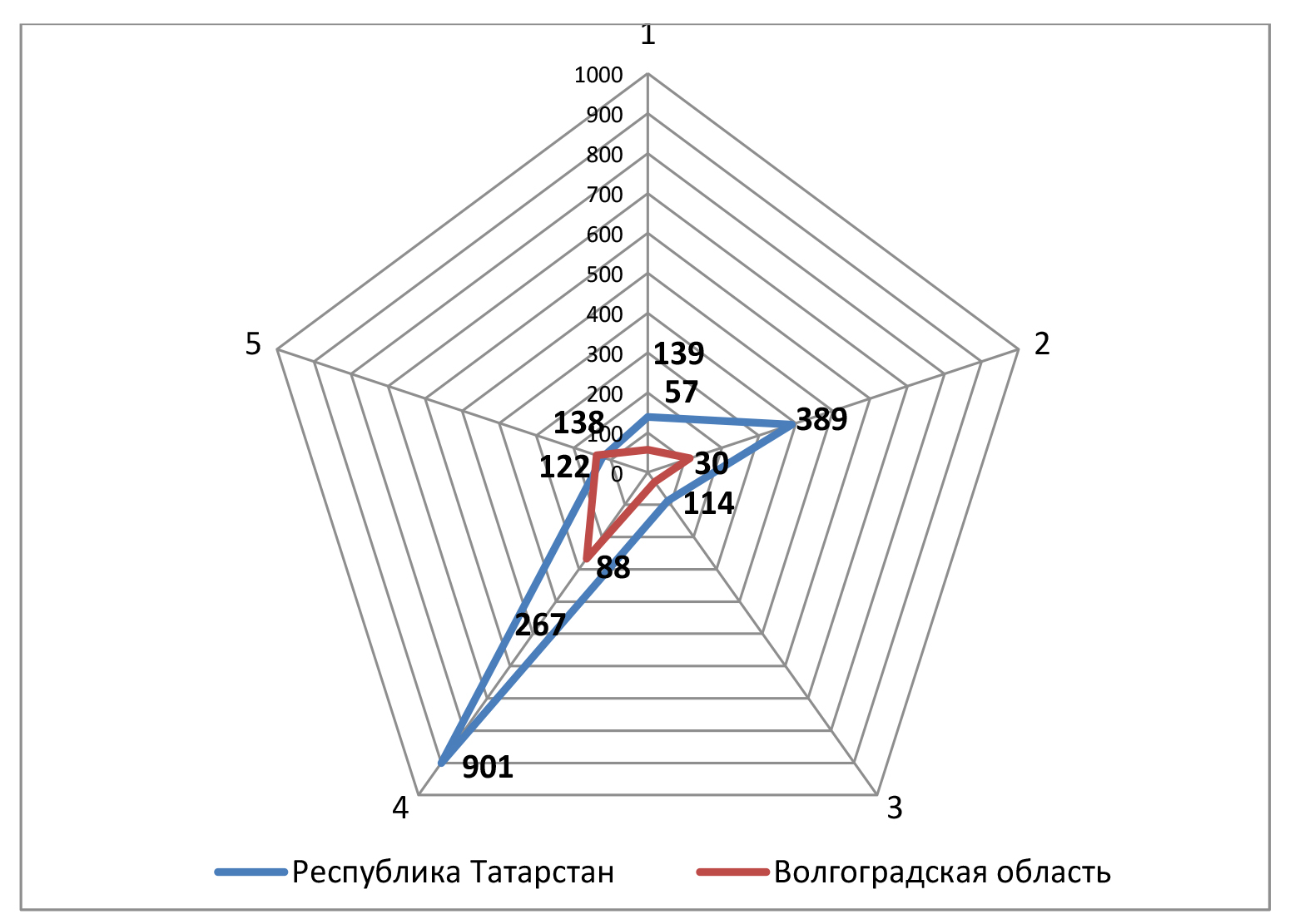 Рис. 2. Фрагмент расчета нуждающихся в ортезировании экзоскелетом «ЭКЗАР-34» по данным официальных отчетов медицинских организаций Республики Татарстан и Волгоградской области. Нозологическая структура нуждающихся: 1 – последствия черепно-мозговых травм с наличием гемипареза и монопареза верхних конечностей, 2 – восстановление утраченных функций верхних конечностей после инсульта головного мозга с гемипарезом и монопарезом верхней конечности, 3 – спинальная амиотрофия, 4 – детский церебральный паралич, 5 – плечевая плексопатия