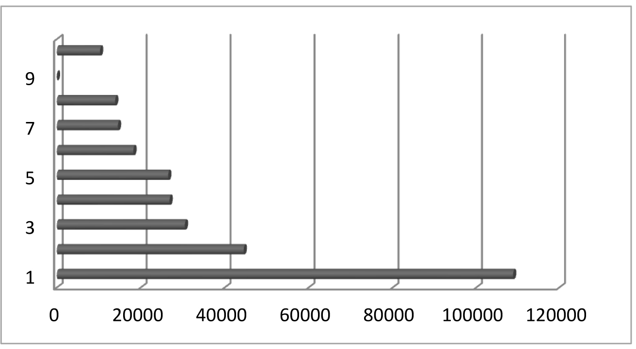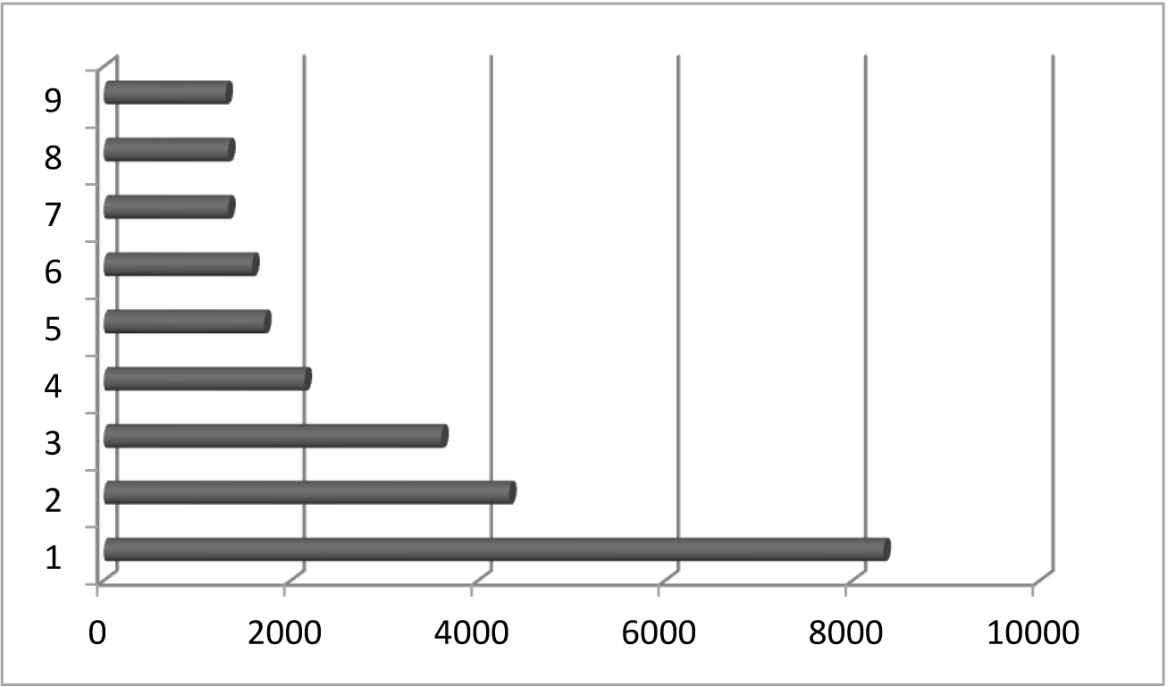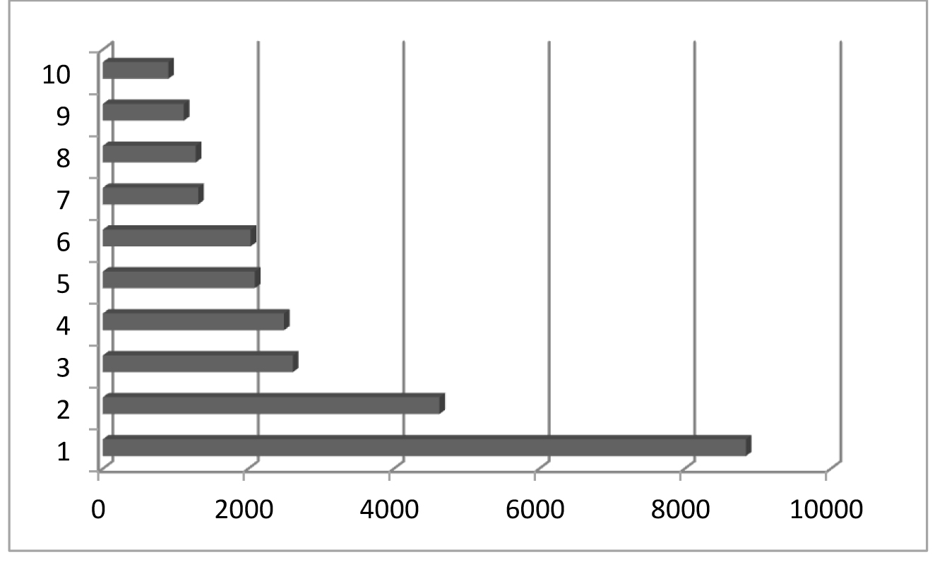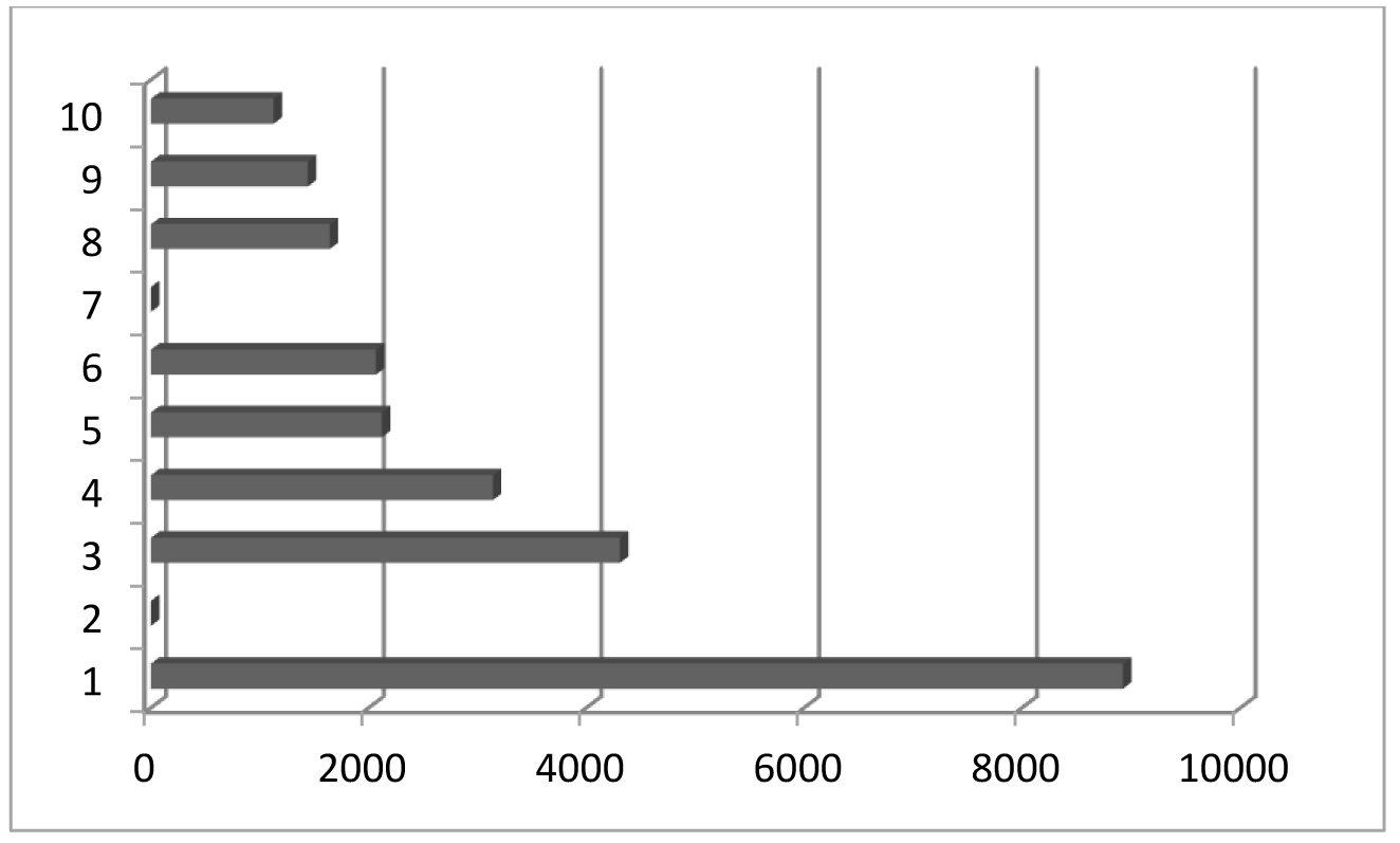 Рис. 4. Структура научных публикаций, размещенных на платформе КиберЛенинка с ключевыми словами «военная медицина» в 2020–2024 гг. По оси ординат: направления научных публикаций по классификатору OECD – 1. Клиническая медицина; 2. История и археология; 3. Науки о здоровье; 4. Экономика и бизнес; 5. Науки об образовании; 6. Фундаментальная медицина; 7. Языкознание и литературоведение; 8. Философия, этика, религиоведение; 9. Право; 10. Политологические науки. По оси абсцисс: число научных публикаций в абсолютных числах