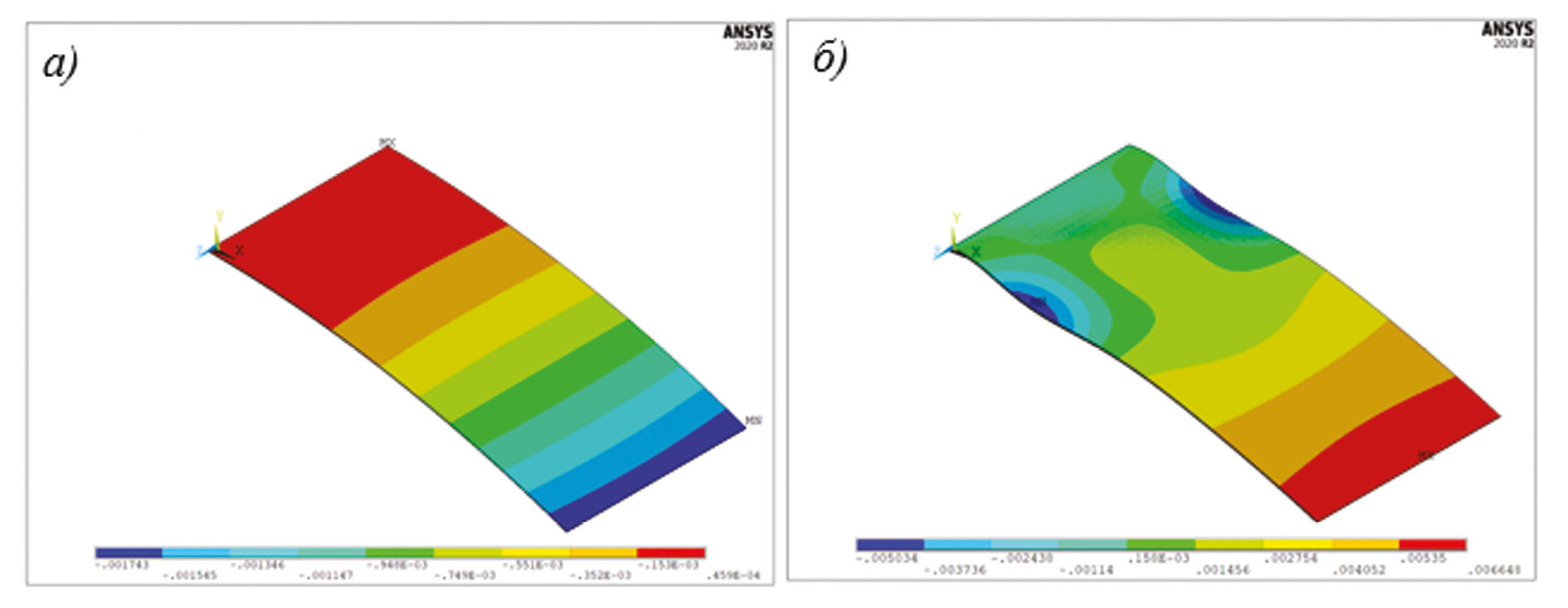 2. Рис. 1. Прогиб точек пластины, соответствующий: а — первому типу закреплений; б — второму типу закреплений [6]