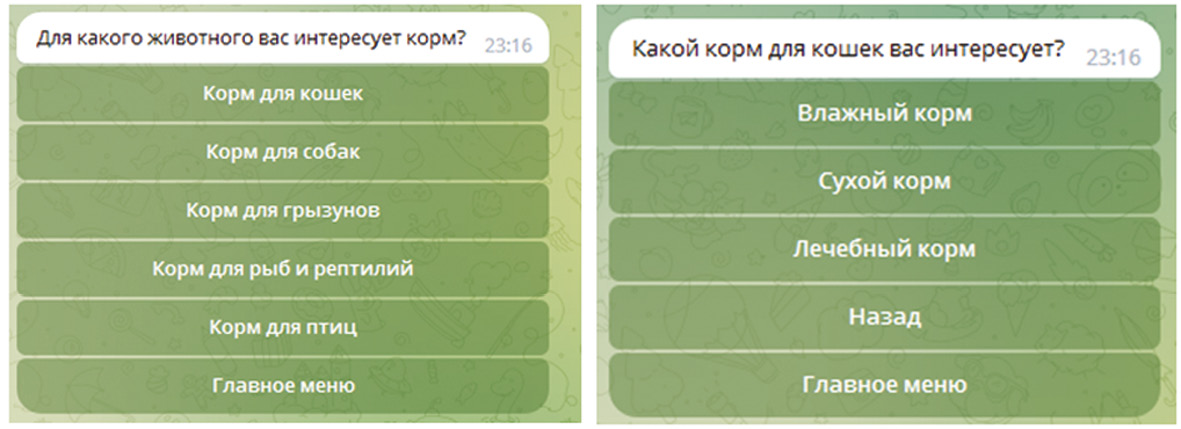 3. Рис. 2. Меню кнопок «Корм для животных» (слева) и «Корм для кошек» (справа)